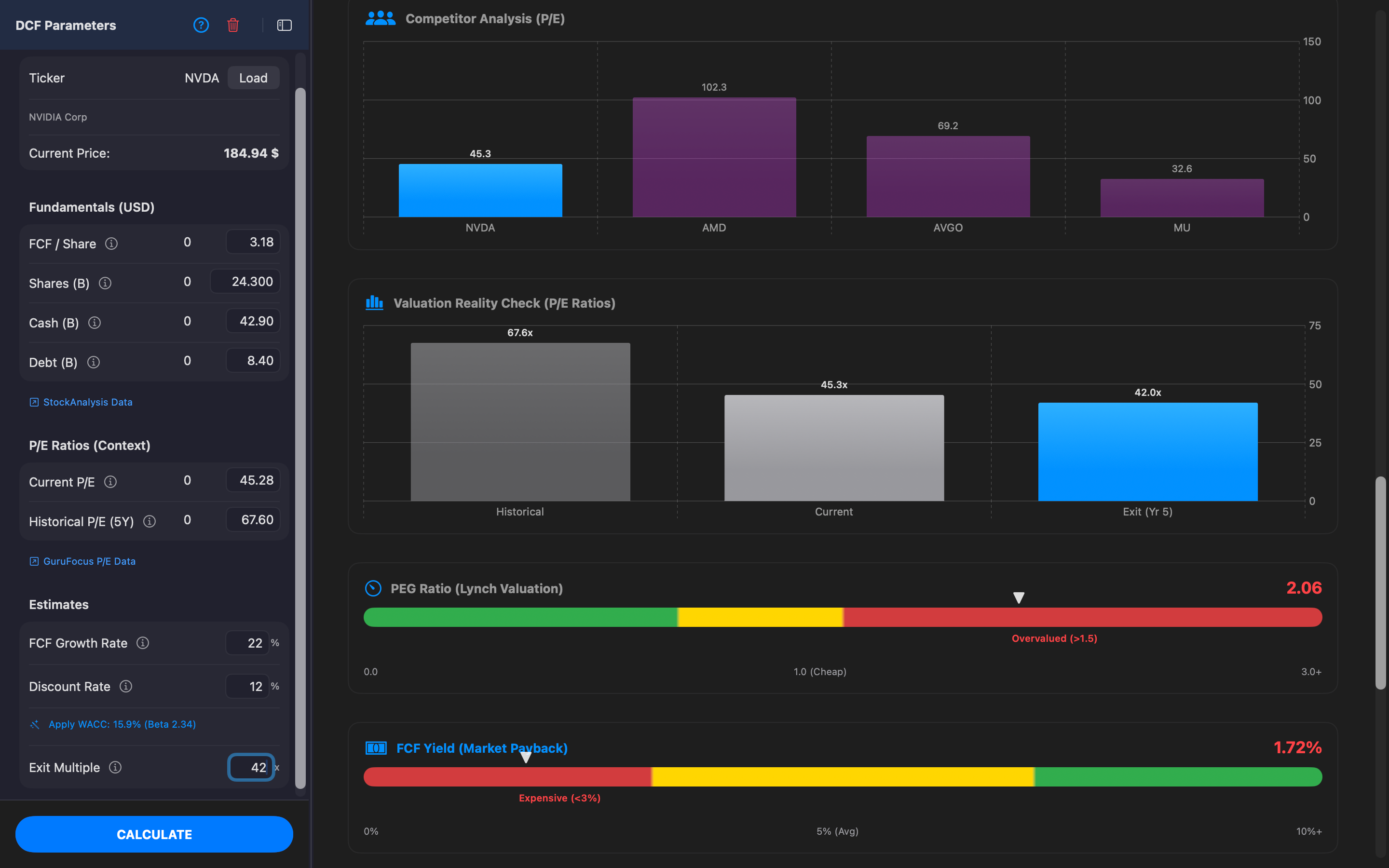 Context matters. Automatically compares your stock's P/E ratio against its top 3 direct industry peers.